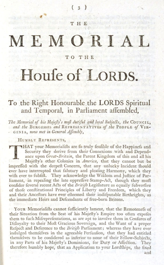 The Memorial of bis Majesty's most dutiful and loyal Subjects, the COUNCIL, and the BURGESSES and REPRESENTATIVES of the PEOPLE of VIRGINIA, now met in General Assembly,
