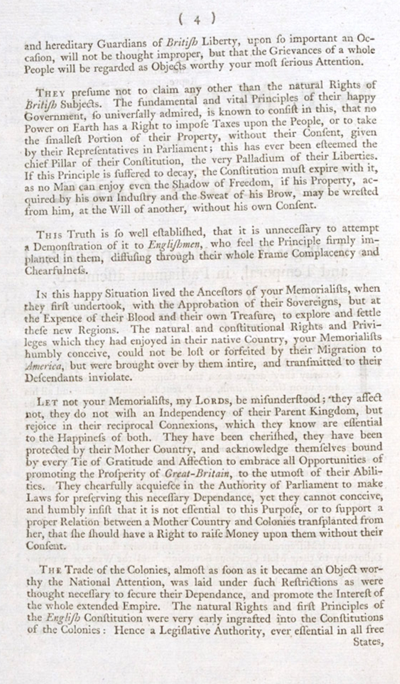 IN this happy Situation lived the Ancestors of your Memorialists, when they first undertook, with the Approbation of their Sovereigns, but at the Expence of their Blood and their own Treasure, to explore and fettle these new Regions. The natural and constitutional Rights and Privileges which they had enjoyed in their native Country, your Memorialists humbly conceive, could not be loft or forfeited by their Migration to America, but were brought over by them intire, and transmitted to their Descendants inviolate.