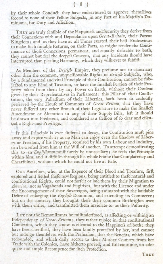 LET not the Remonstrants be misunderstood, as affecting or wishing an Independency of Great-Britain ; they rather rejoice in that constitutional Connexion, which they know is essential to the Happiness of both; they have been cherished, they have been kindly protected by her, and cannot but indulge themselves with the Persuasion, that the Benefits which have redounded, and which daily accrue to their Mother Country from her Trade with the Colonies, have hitherto proved, and quate and ample Recompence for such Protection.
