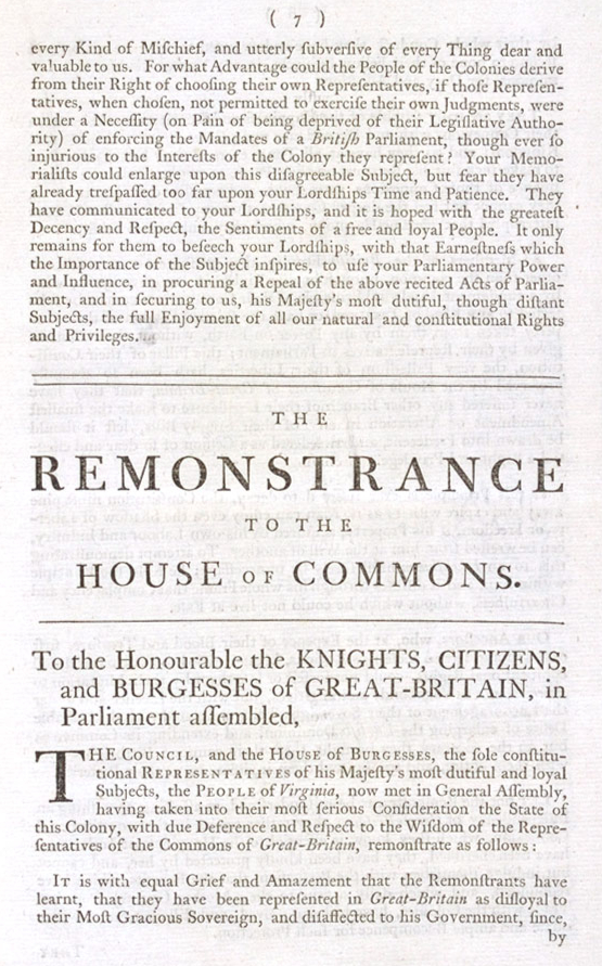 THE COUNCIL, and the HOUSE of BURGESSES, the sole constitutional REPRESENTATIVES of his Majesty's most dutiful and loyal Subjects, the PEOPLE of Virginia, now met in General Assembly, having taken into their most serious Consideration the State of this Colony, with due Deference and Respect to the Wisdom of the Representatives of the Commons of Great-Britain, remonstrate as follows:
